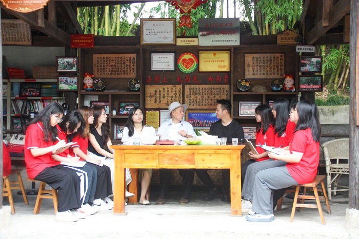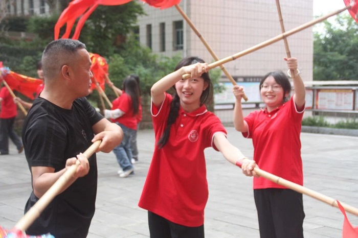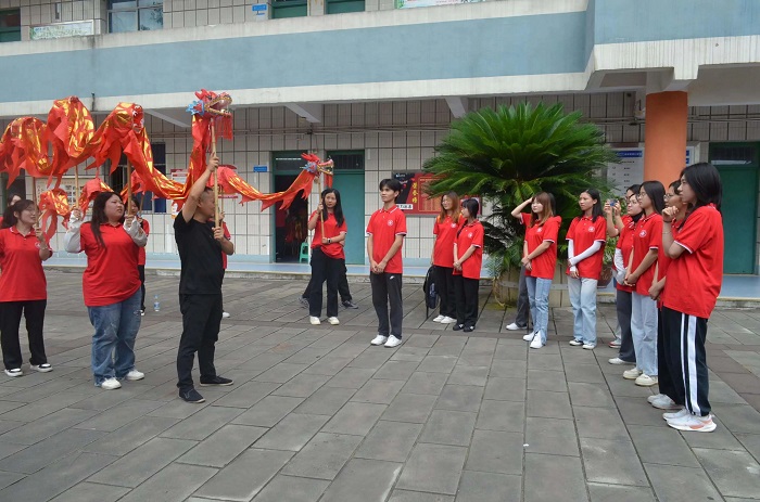 弘扬传统文化,传承非遗技艺。当日下午,志愿者们来到永川双石中学,走进重庆市非遗双石小金龙传,倾听非遗传承人杨光华老师讲诉他与小金龙的不解之缘。现场体验和学习促进非遗文化发扬光大,激发青年的奋斗力量,书写新时代的“龙的传人”。