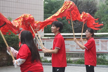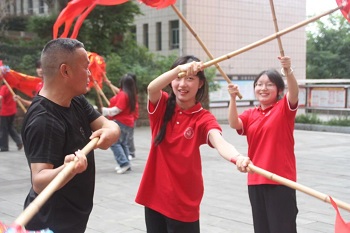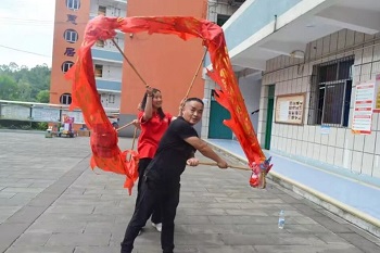 小金龙舞蹈由龙舞演变而来,最初的小金龙是以稻草扎制而成,因其颜色金黄而得名,小金龙长短有3米和5米由舞蹈人数而定,以“8”字形舞动,形式多样,可在田间、院坝、舞台等地进行表演,是老百姓喜爱的民间舞蹈表演形式。讲解结束后,杨光华老师带领志愿者们进行实操舞龙训练,系统地学习了“起龙”“龙翻身”“神龙甩尾”等多项舞龙技巧。志愿者们也在舞动小金龙的过程中感受到非遗文化的乐趣,同时也深感其中不易,对此又多了几分敬意。