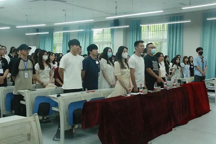 会议伊始,全体成员起立,伴随庄严的共青团团歌《光荣啊,中国共青团》,本次述职评议会正式开始。