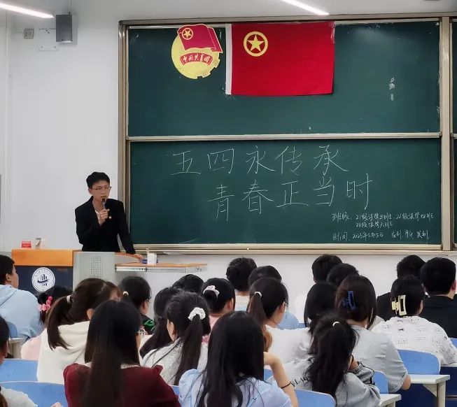 为培育和弘扬社会主义核心价值观,学习五四精神,进一步弘扬五四“爱国、民主、进步、科学”的重要精神,增强同学们学习弘扬五四精神。5月15日中午,21级法学2班,22级法学4班、6班共同开展以“五四永传承,青春正当时”为主题的校级示范性团日活动。此次团日活动由蔡玉森主持,校团委及各二级学院观摩考核组代表参加。