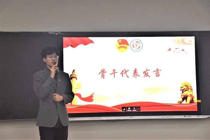 学生代表陈豪发言,他以团徽的构成为切入,通过诙谐幽默的语言勉励各位同学加强青年大学习的完成,现场氛围轻松愉快。他讲到青年学生应该充分了解团旗和团徽的意义,积极向党靠拢,在每周青年大学习的培养下提高自己的思想政治素养,他还呼吁青年学生要发奋学习,将来才能更好的为人民服务、为祖国服务。