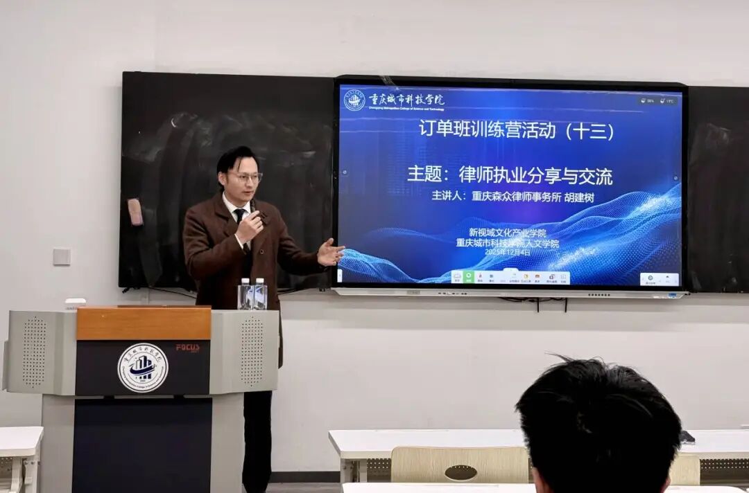 为强化我校校企协同育人机制,有效衔接理论学习与法律实务操作,提升订单班学生的职业竞争力与未来职业发展潜力。2025年12月4日下午,由人文学院与新视域文化产业学院共同举办的律师订单班第十三期实训营活动在第五教学楼206教室召开。本次活动特邀重庆森众律师事务所主任胡建树律师和汪鹏律师担任主讲嘉宾,为订单班学员带来了一场精彩的法律实务课堂分享。