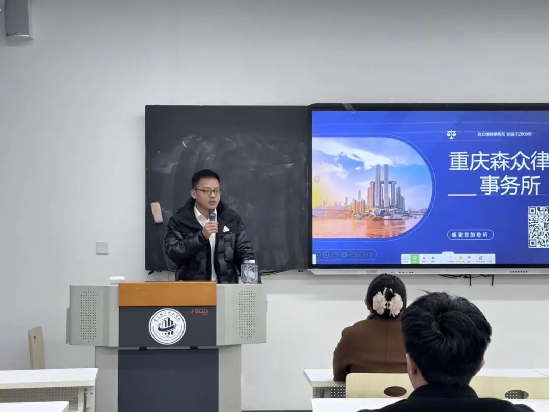 讲座伊始,胡律师主要从律所概况、团队介绍、服务项目、合作伙伴等四个方面进行介绍。同时介绍了重庆森众律师事务所的招聘需求,邀请同学积极应聘,加入团队。