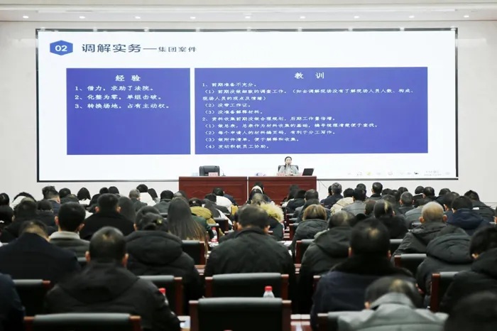王丹丹以《专职调解员的职业前景及重大案件调解实务》为题,从职业前景和实务案件分享以及建议等三个方面,系统阐述了新时代如何发展好“枫桥经验”,如何切实解决基层调解工作及难题等内容。宣讲内容丰富、主题鲜明、案例生动,具有很强的指导性和实践性,加深了基层调解员对调解工作的理解。