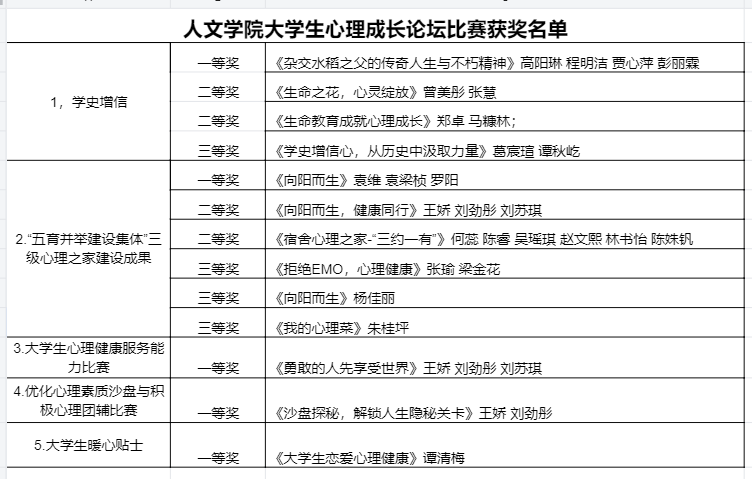 第十六届大学生心理成长论坛共设有大学生“学史增信”心理成长微课比赛 、“五育并举建设集体”三级心理之家建设成果比赛、大学生心理健康服务能力比赛等共计七个比赛项目。经同学递交、评委评定,以下为此次活动获奖名单。