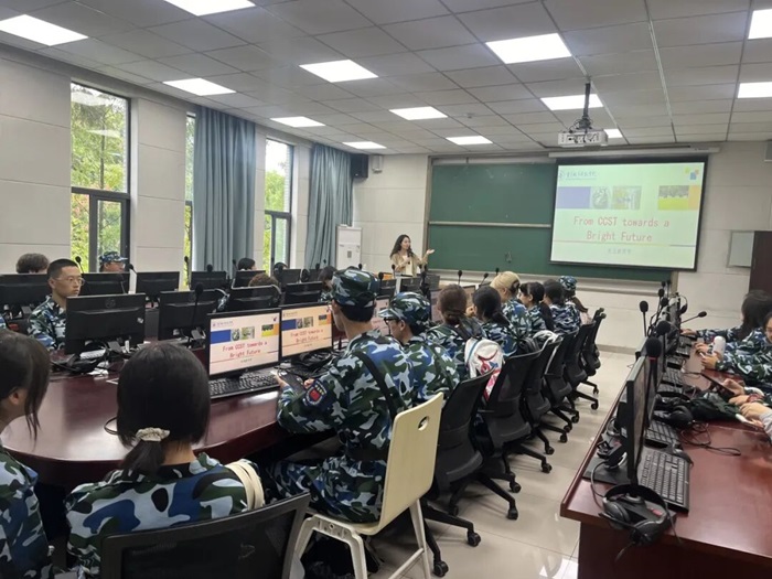 课程尾声,赵玲、蔡永玲两位教师带领新生参观外国语言与文化系智慧语音实验室。在参观过程中,老师们详细介绍了设备的功能和使用方法,让新生们对外语学习的硬件设施有了更直观的了解。从AI辅助同声传译训练系统到多模态听力实训平台,学生们亲身体验到了科技赋能下的语言学习场景,他们纷纷表示,这些先进的设备将为他们的外语学习提供有力的支持。