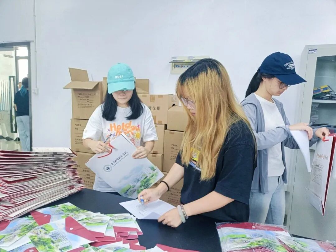 目前,迎新现场的物资准备、流程动线、人员分工等核心工作已全部就绪。其中,针对新生 VIP 服务袋,志愿者严格执行 “分装 — 核对 — 质检” 全流程,仔细清点寝室钥匙、智慧校园使用指南、体检报告等材料,确保每份礼包准确齐全,将学校的关怀精准传递给新生。
