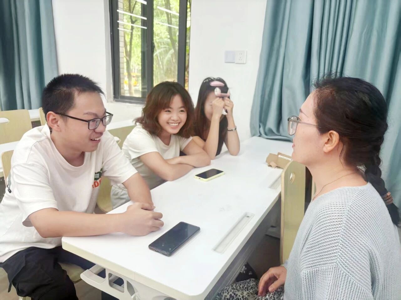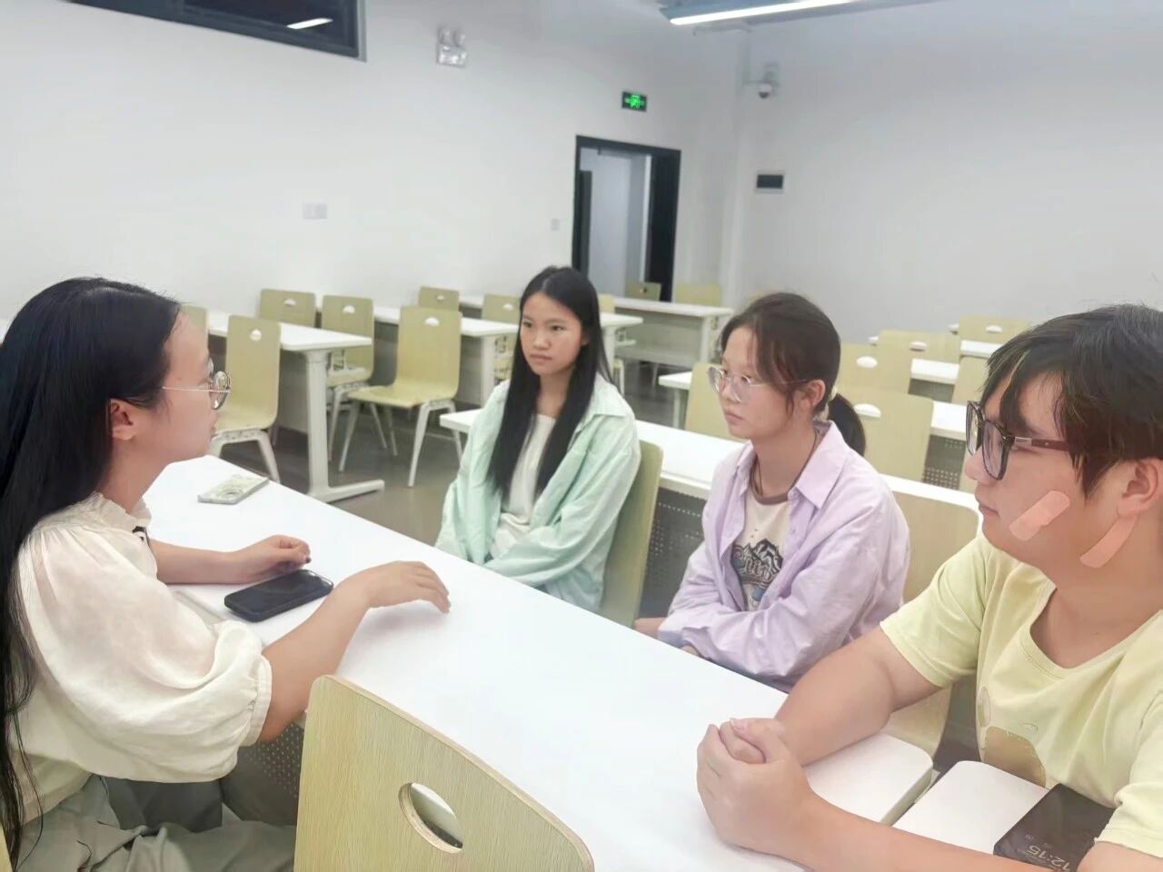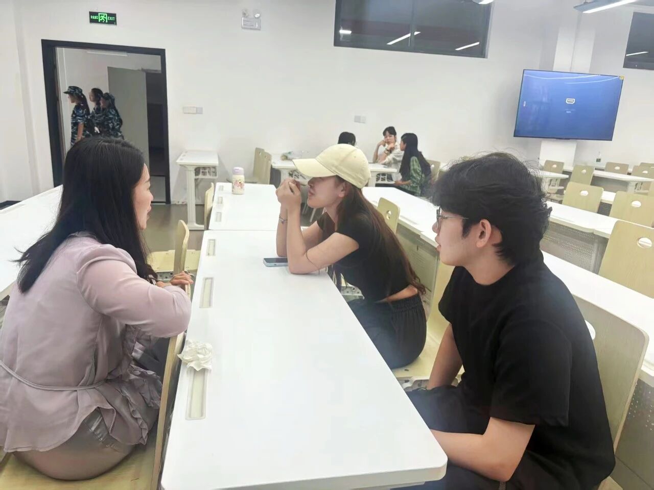 班会结束后,同学们迎来了与个性化指导老师的面对面深入交流环节。教室里,师生们围坐在一起,围绕专业学习规划、专四备考策略等关键议题展开了热烈而深入的探讨。老师们凭借丰富的教学经验和专业知识,针对每位同学的实际情况,提供了极具针对性和可操作性的个性化建议与精准指导。交流现场气氛热烈非凡,同学们积极提问、认真倾听,不时记录下老师的宝贵建议。