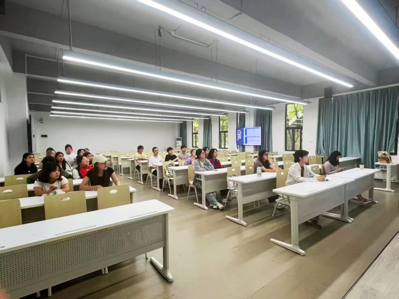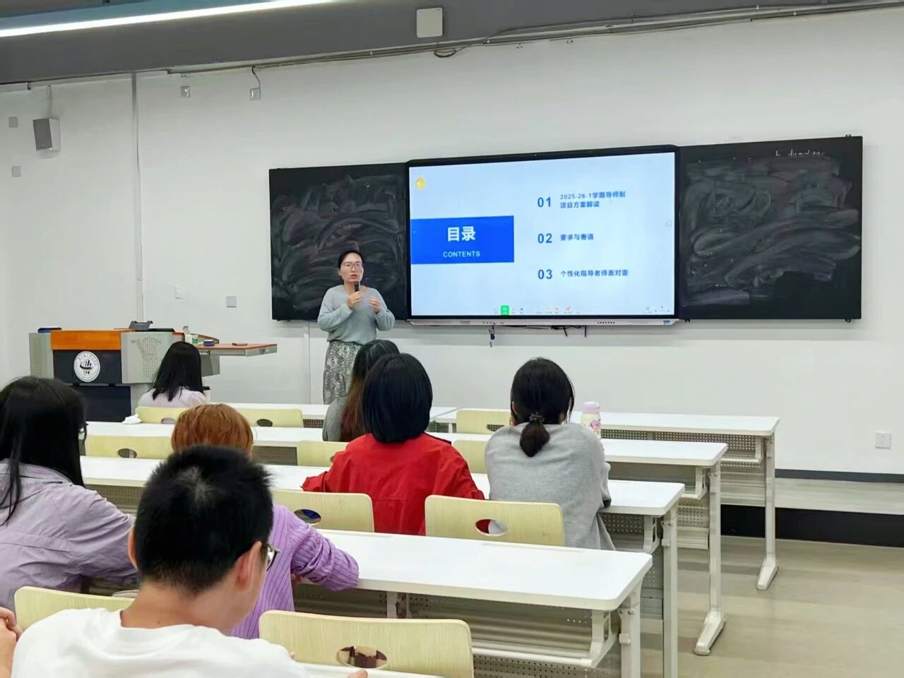 会议伊始,许老师以专业且细致的讲解,为同学们详细勾勒出本学期班级丰富多元的课程与专题讲座蓝图。为全方位提升学生的综合竞争力,本学期卓越班在课程设置上精心布局,特别增设了BEC商务英语、外国文学名著导读、日语等多门实用课程。这些课程犹如一把把钥匙,将为学生打开不同领域的知识大门,助力他们在未来的职业道路上拥有更广阔的选择空间。