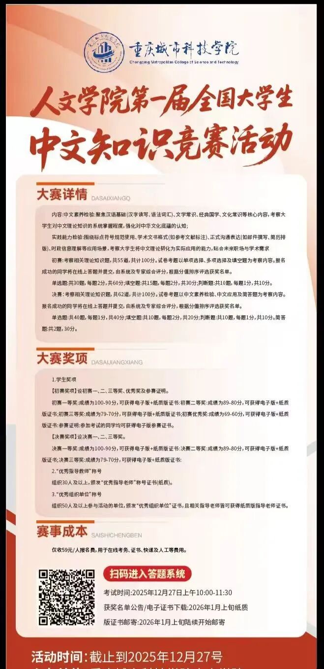 为深化习近平新时代中国特色社会主义思想教育,落实 “三进” 工作要求,切实提升学生中文素养与文化传承能力,近日,重庆城市科技学院新视域文化产业学院、人文学院积极响应号召,组织全院学生参与由中华出版促进会主办、新视域文化产业学院协办的全国大学生中文知识竞赛,以赛为媒搭建学习交流平台,助力学子讲好中国故事、夯实专业根基。