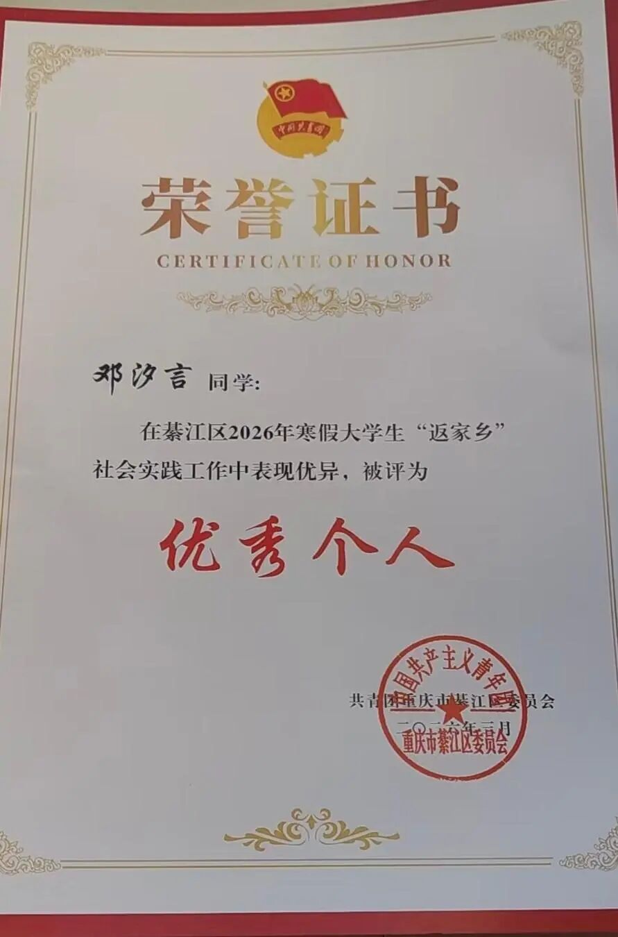 寒假期间,人文学院23级法学14班的邓汐言同学响应“返家乡”社会实践号召,加入綦江区文龙街道代家岗社区公益托管志愿服务队,全程参与了为期8天的假期公益托管服务。