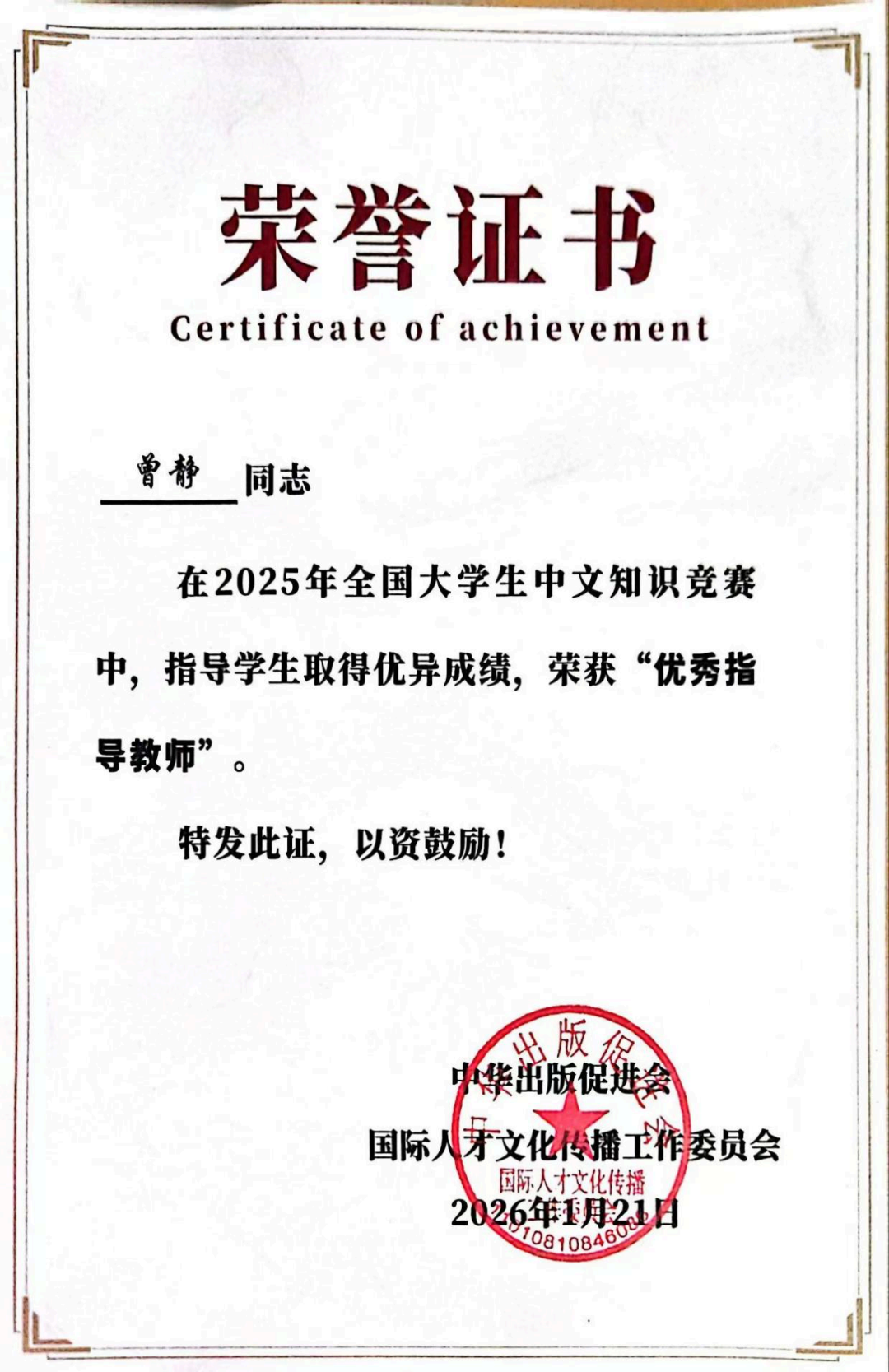 笔墨书香润初心,赛场竞辉展芳华!近日,2025 年全国大学生中文知识竞赛圆满落幕。重庆城市科技学院新视域文化产业学院学子凭借扎实的专业功底、深厚的文化积淀与出色的临场发挥,在全国赛场脱颖而出、斩获多项荣誉;多位教师凭借专业指导与用心组织荣获优秀指导教师称号,师生同心共筑荣光,充分彰显学院在语言文字教育领域的硬核实力与育人成果。