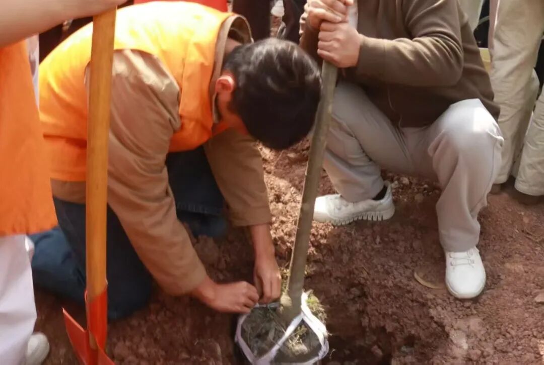 活动现场秩序井然、氛围热烈,师生们分工协作、默契配合,有序完成挥锹铲土、扶苗定植、培土压实、提水浇灌等各项工序,栽种过程细致认真。